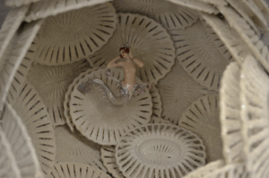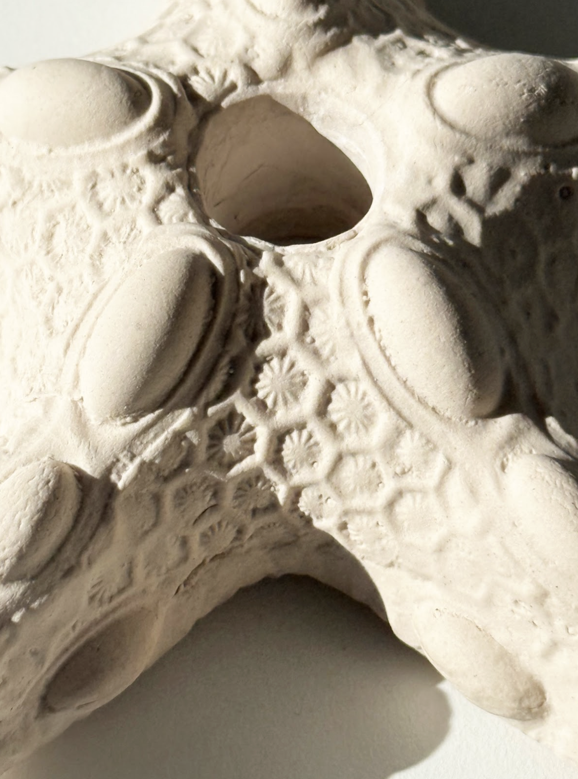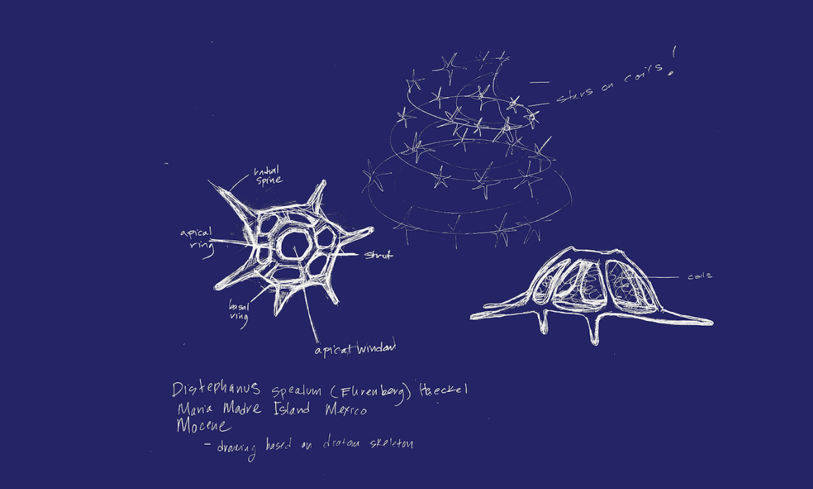 It combines a Biorock structure that accretes calcium carbonate, forming a substrate three times stronger than concrete, with a coral sexual larval propagation technique that seeds star-shaped substrates with genetically robust, cross-fertilized coral gametes. The nursery would act as both a structure to affix the coral larval substrates with a structure that would also act as a wave attenuator protecting fragile shorelines. The “Plankton Pod ” design inspired by the Distephanus boliviensis, a flat-bottomed unicellular phytoplankton, enabling it to drift gracefully and slowly through the photic zone and provide a stable environment for reef restoration. This artistic endeavor showcases a pioneering approach to coral conservation, blending scientific principles with sustainable materials to move away from traditional plastic or concrete methods .